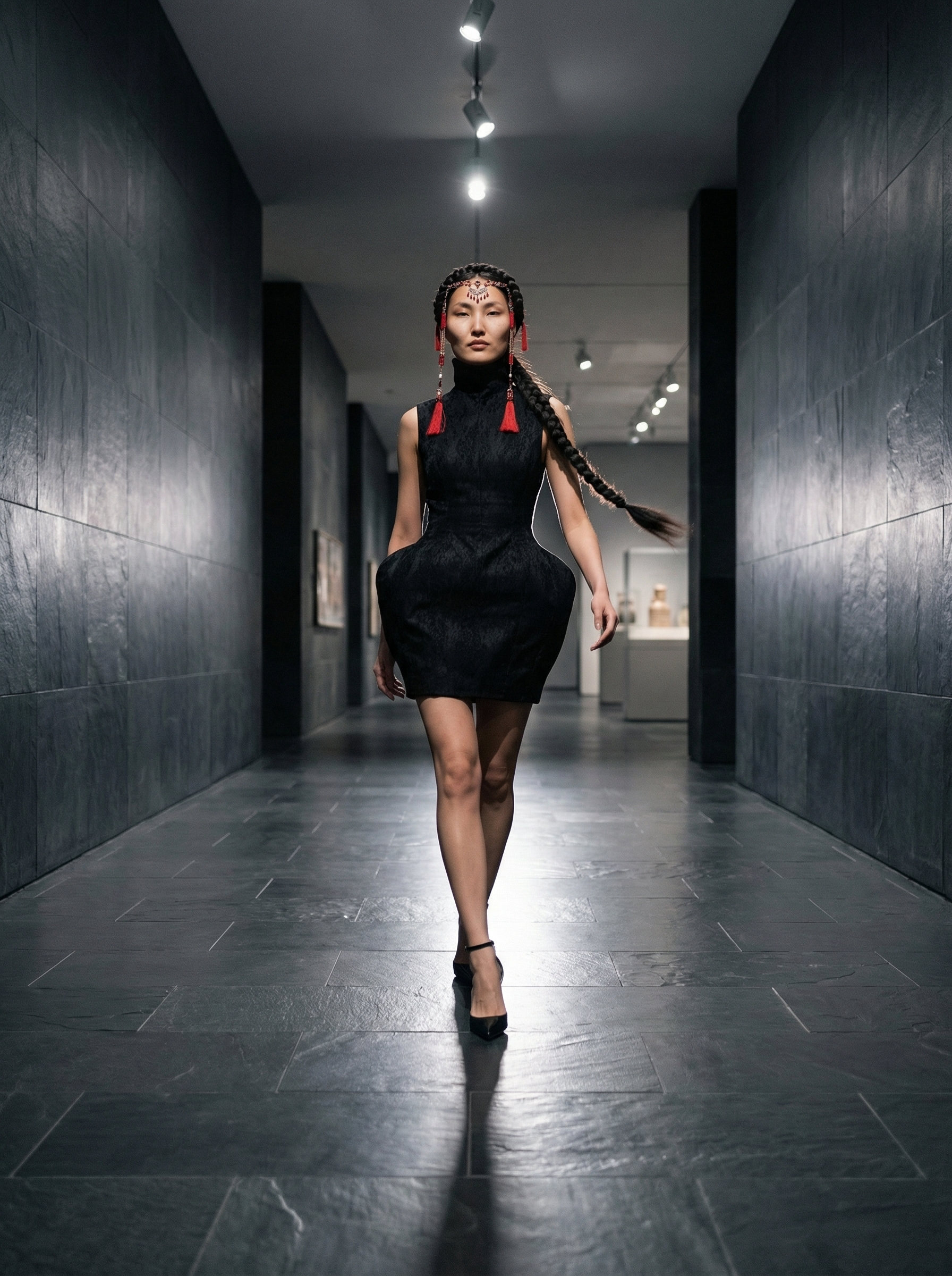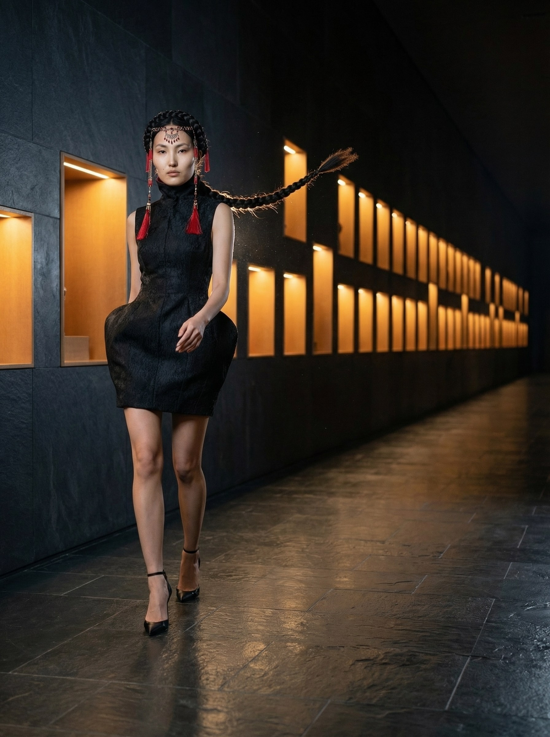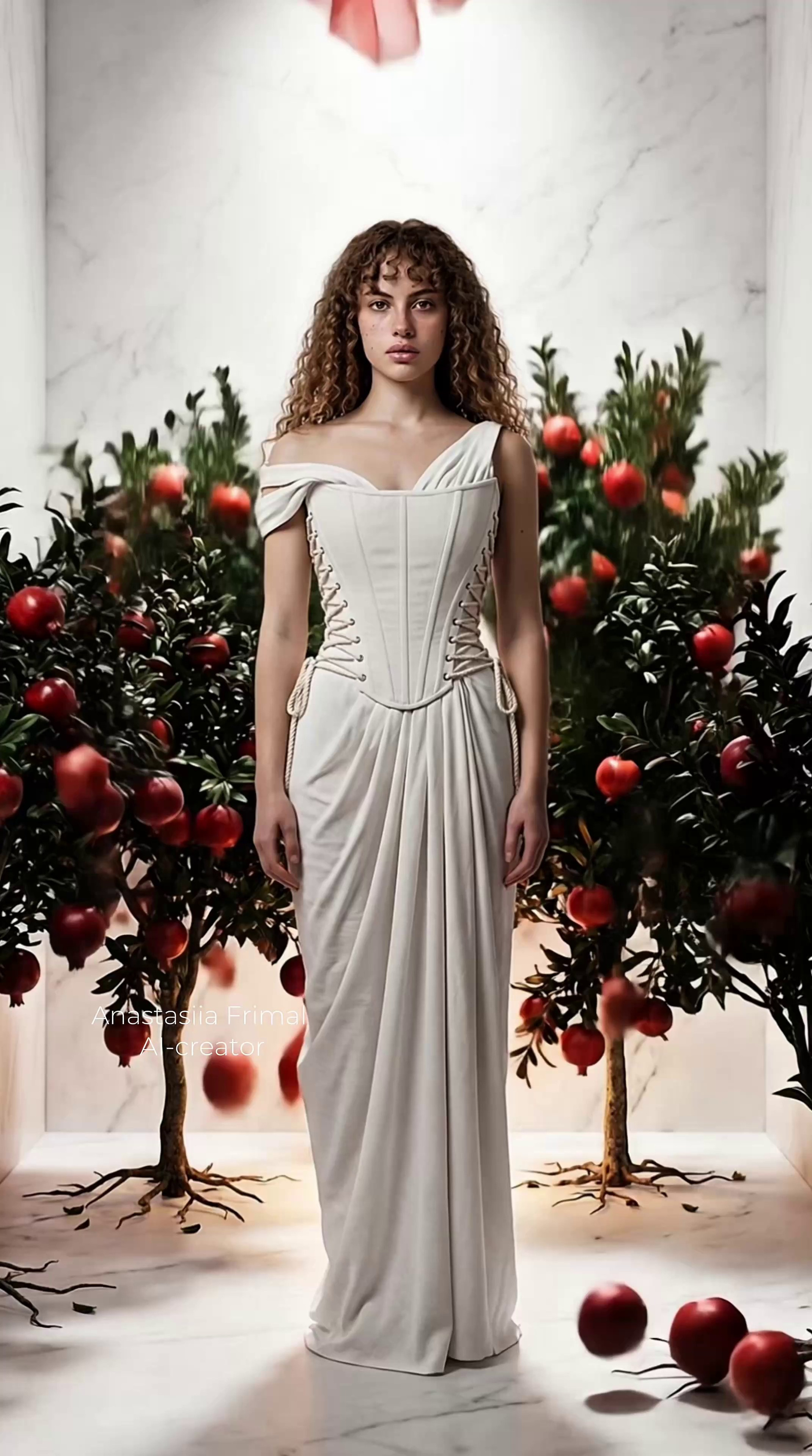 Генерация ИИ-модели, разработка концепции съёмки, перенос реального платья на ИИ-модель, генерация нейрофотосессии.