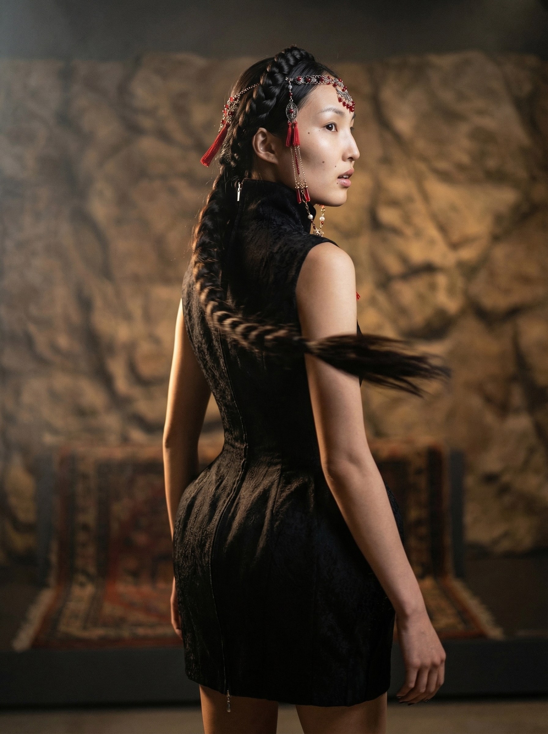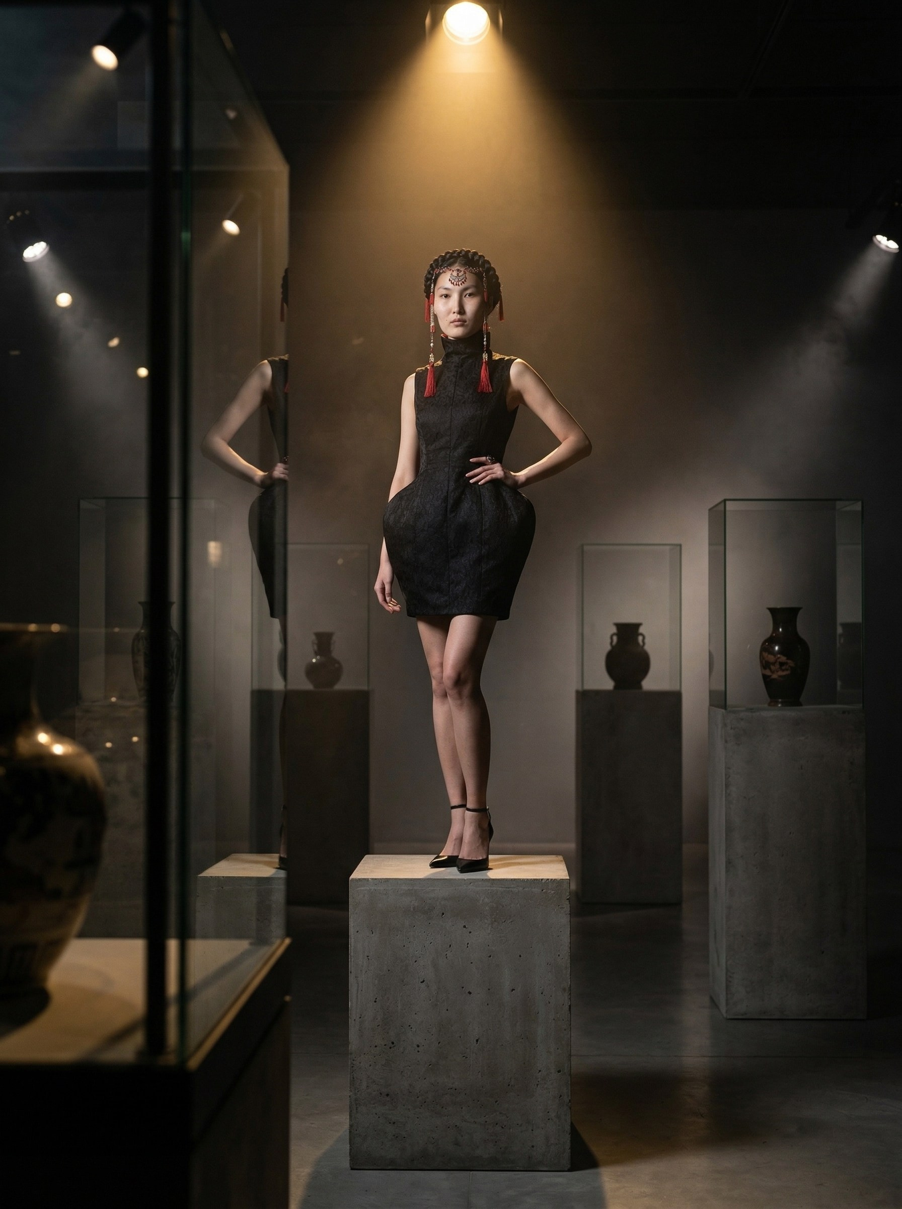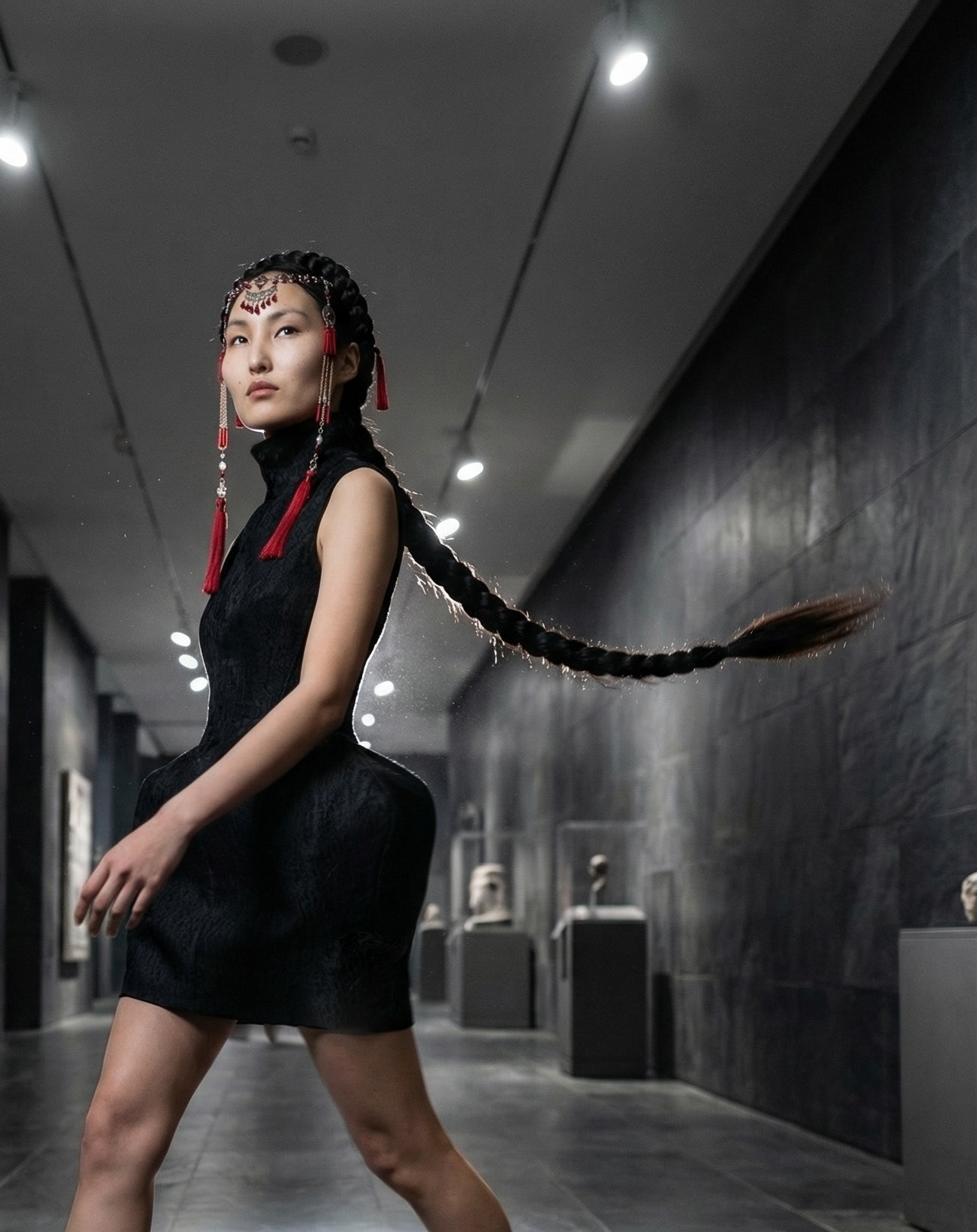 Генерация ИИ-модели, разработка концепции съёмки, перенос реального платья на ИИ-модель, генерация нейрофотосессии.